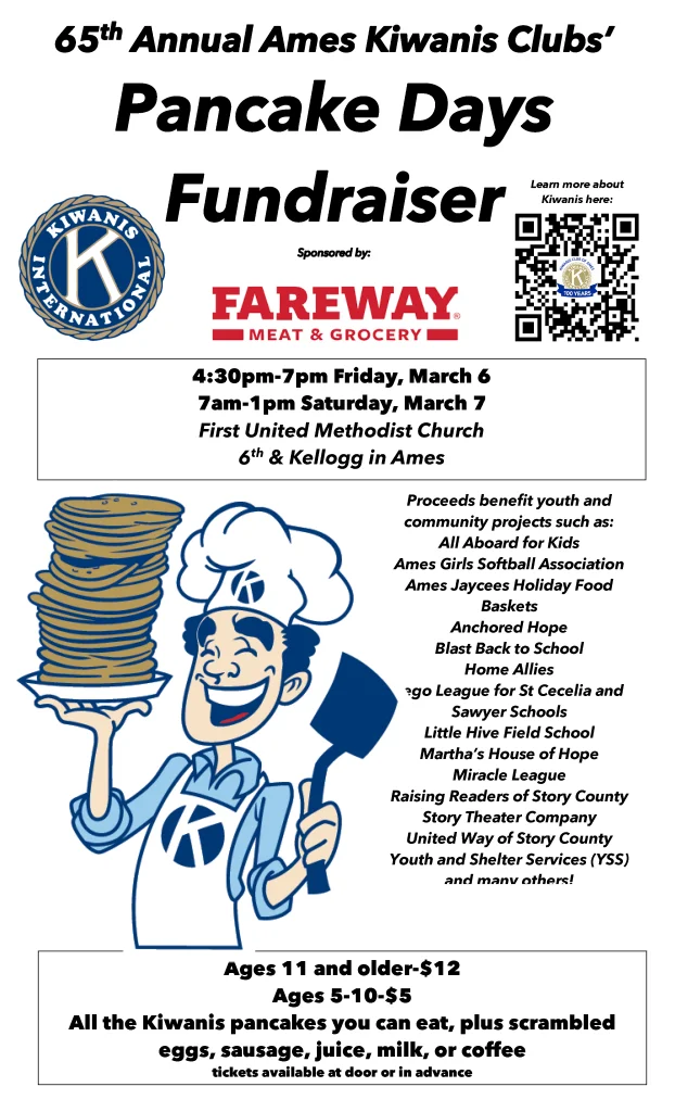 Support the Ames Kiwanis Club by volunteering at Pancake Days! Kiwanis is looking for volunteers on Saturday, March 6. Please sign-up with the Sign-Up Genius HERE.